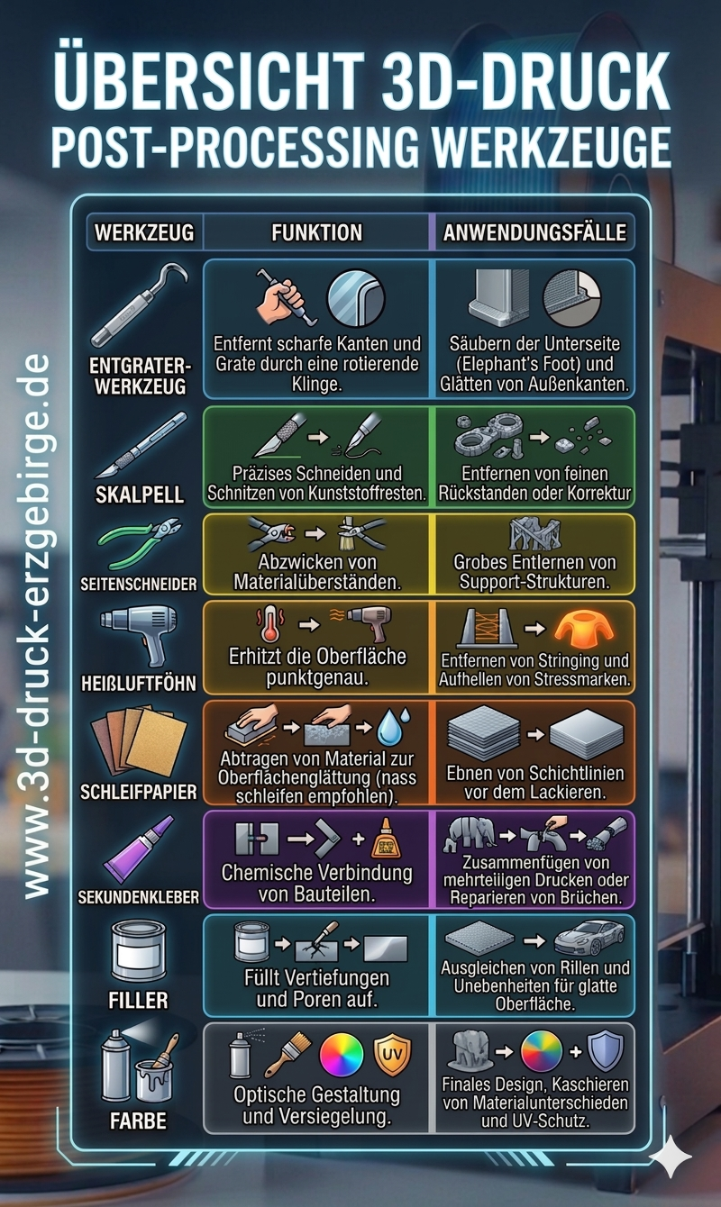 Diese Übersicht zeigt die essentiellen Werkzeuge, welche für die Nachbearbeitung von gedruckten Teilen unerlässlich sind.