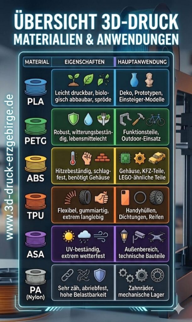 Dies ist eine Übersicht über die gängigsten 3D-Druckmaterialen. Die Aufzählung ist nicht abschließend. Außerdem sollten für jedes Filament immer die Herstellervorgaben beachtet werden.