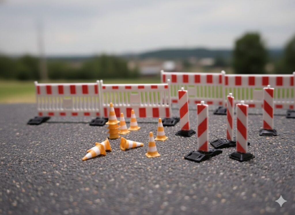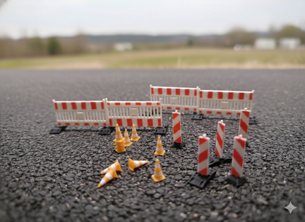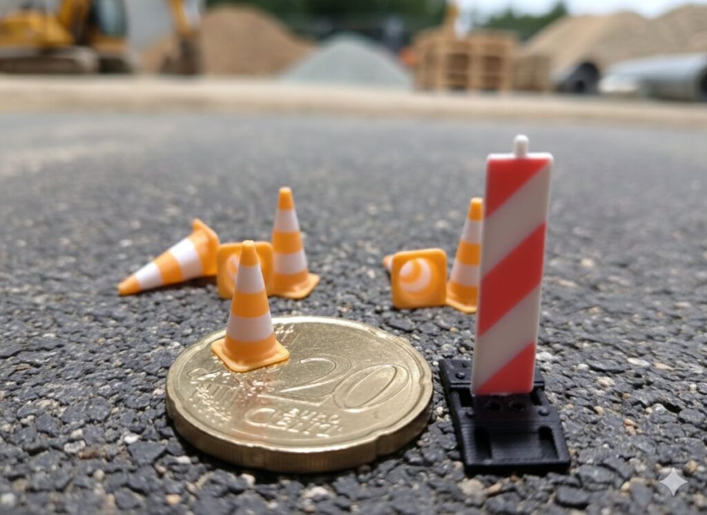 Baustelleneinrichtung im Mehrfarbdruck, Maßstab 1:50, Maße Pylone: 4x4x10mm